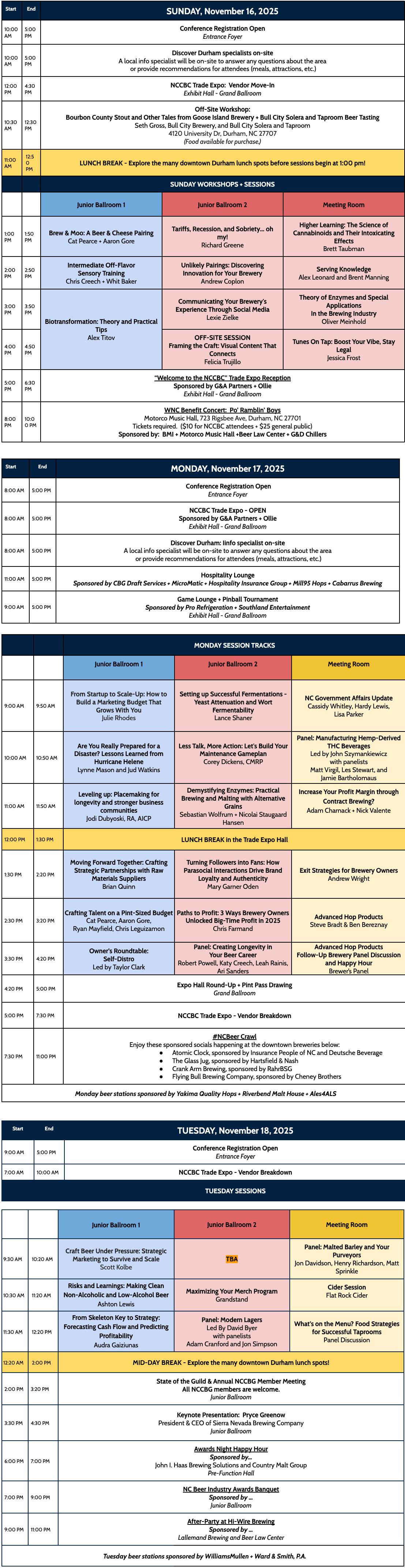 Explore the 12th annual NCCBC conference schedule – your essential guide to a dynamic lineup of sessions, workshops, and networking opportunities designed to inspire, educate, and elevate the North Carolina craft brewing community! Scroll to see the full schedule, or explore the speakers and session descriptions below!